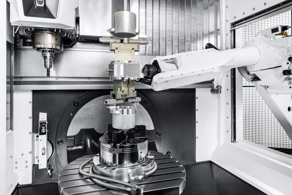 Daarnaast prijkt een DMU 50, een simultaan vijfassige freesmachine van de derde generatie. “Ons meest verkochte model. We wilden echt de machines tonen die vandaag relevant zijn in metaalbewerking. We gaan er hier op Machineering NextGen Experience een typisch stuk voor machinebouw op maken. Omdat er in de brede regio rond Kortrijk heel wat aanwezig is”, duidt Van Bellinghen de keuze. De vijfasser is verbonden met de Robo2Go Milling Drawer, een eigen automatiseringsoplossing van DMG Mori. “Een heel flexibele en compacte oplossing voor beladen en ontladen om ook kleine en middelgrote series efficiënt te automatiseren”, zegt Van Bellinghen daar nog over. Het teamwerk binnenin de freesmachine komt in dit geval van EMUGE-FRANKEN (snijgereedschappen) en Blum-Novotest (lasermeting). Buiten de machines zorgen Haimer en Mitutoyo telkens respectievelijk voor het voorinstellen van de gereedschappen en het nameten van de stukken, zowel voor het draaien als het frezen.