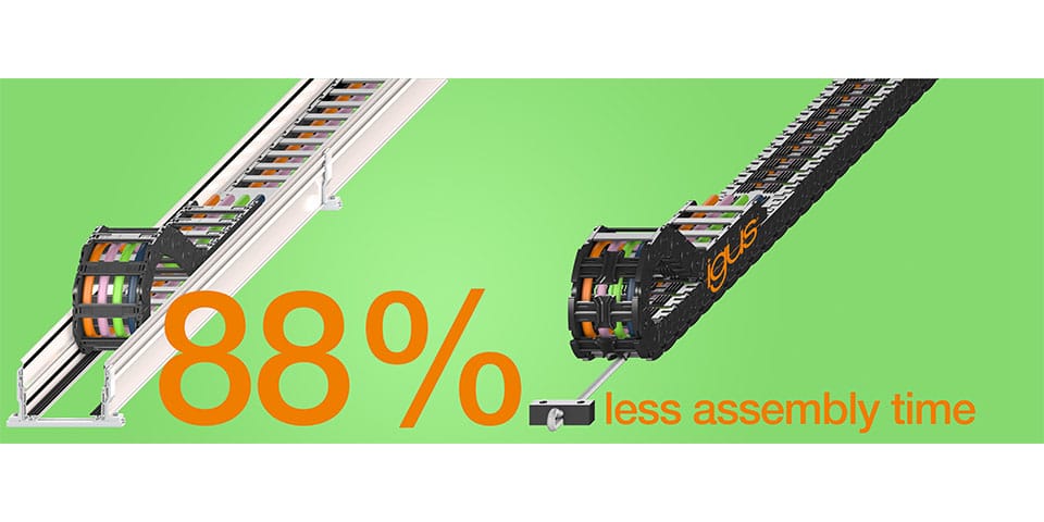 Het veilig geleiden van energie over lange rijwegen en tegen lage kosten: dat was het doel achter de ontwikkeling van autoglide 5 van igus. Het nieuwe kabelrups-systeem is specifiek ontworpen voor horizontaal gebruik in intralogistieke toepassingen en op kraansystemen. Het speciale kenmerk: de energietoevoer is snel geïnstalleerd, omdat het geen geleidegoot nodig heeft. In plaats daarvan ligt het op een staalkabel die op haar plek wordt gehouden door de contouren van de kabelrups.