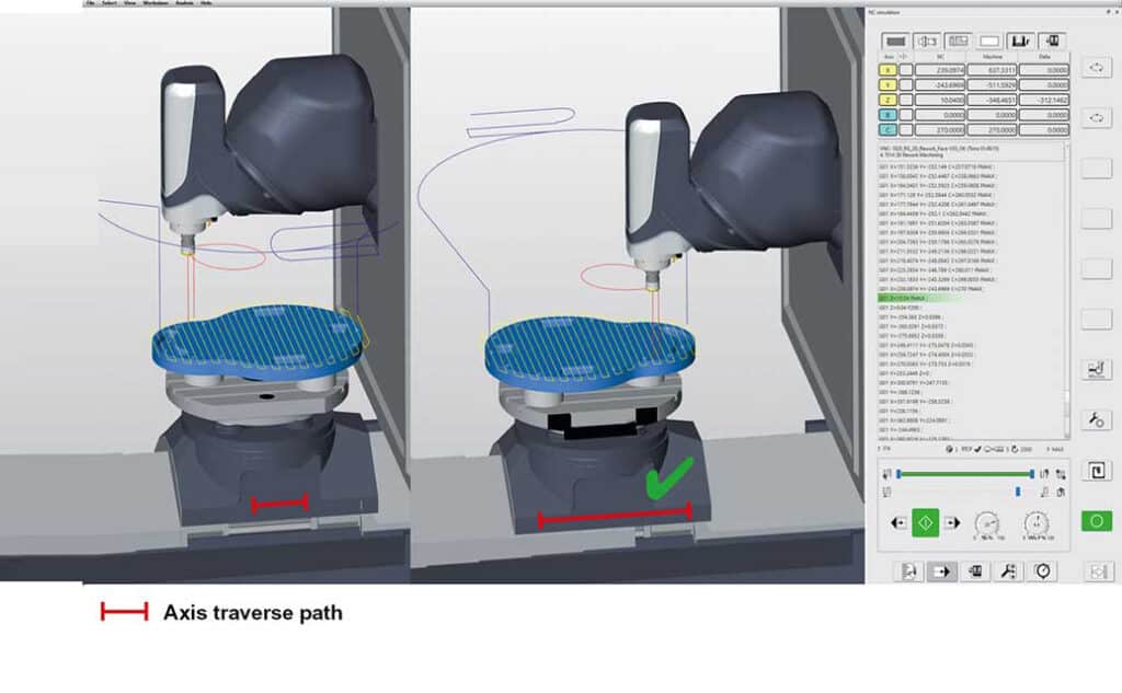 hyperMILL® VIRTUAL Machining enables simulations and analyses with maximum precision as it works with the real NC codes. Two of the most important enhancements in version 2021.2: Violations of the axis limitations are detected and movement sequences are optimized accordingly. To do this, the Optimizer tool can break G1 toolpaths, find a new mating within the axis limits, and continue machining. Here, the approach and retract movements are smoothly linked to the toolpaths and checked for collisions. This ensures that the axis limits are not overrun. There is also a new option to apply a special approach and retract strategy to machines where the tool can be retracted into a tunnel.